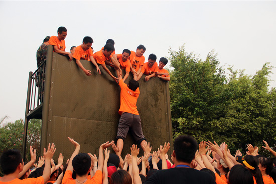 這兩個(gè)項(xiàng)目完成后,我們的大團(tuán)隊(duì)來(lái)到了操場(chǎng),拍了集體照,各個(gè)公司和各個(gè)小隊(duì)也分別拍了照片。隨著留影紀(jì)念結(jié)束,最后一個(gè)項(xiàng)目,也是讓人印象最深刻的一個(gè)項(xiàng)目到來(lái)了。畢業(yè)墻,也叫“夢(mèng)想之墻”。所有人,不能借助任何道具,單純依靠身體的力量,要全部爬上4.7米高的鐵墻。一馬當(dāng)先的隊(duì)員、甘當(dāng)人柱的隊(duì)員、奮力抓取的隊(duì)員、默默守護(hù)的隊(duì)員和幾乎沒(méi)有任何可以依靠的最后一名隊(duì)員。每個(gè)人都在這個(gè)項(xiàng)目里找到了自己的角色,并順利地完成了自己的使命。當(dāng)最后一名隊(duì)員——黃永星童鞋爬上了夢(mèng)想墻后,歡呼聲、鼓掌聲頓時(shí)響徹每個(gè)人耳邊。