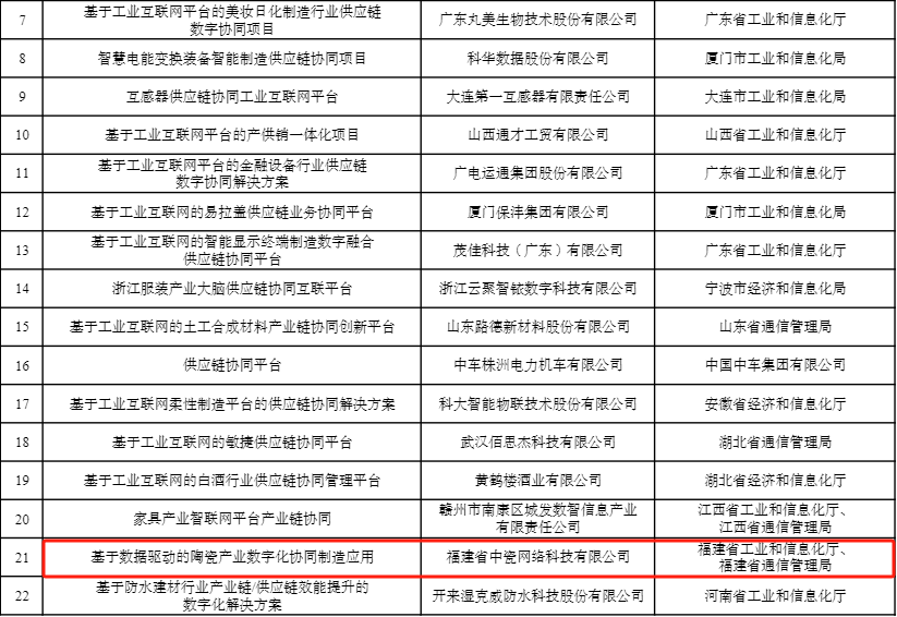 日前,工信部發(fā)布了2023年工業(yè)互聯(lián)網(wǎng)試點示范名單,愛陶瓷平臺(中瓷網(wǎng)絡)憑借“基于數(shù)據(jù)驅(qū)動的陶瓷產(chǎn)業(yè)數(shù)字化協(xié)同制造應用”成功入選工業(yè)互聯(lián)網(wǎng)平臺+產(chǎn)業(yè)鏈/供應鏈協(xié)同試點示范,祝賀!
